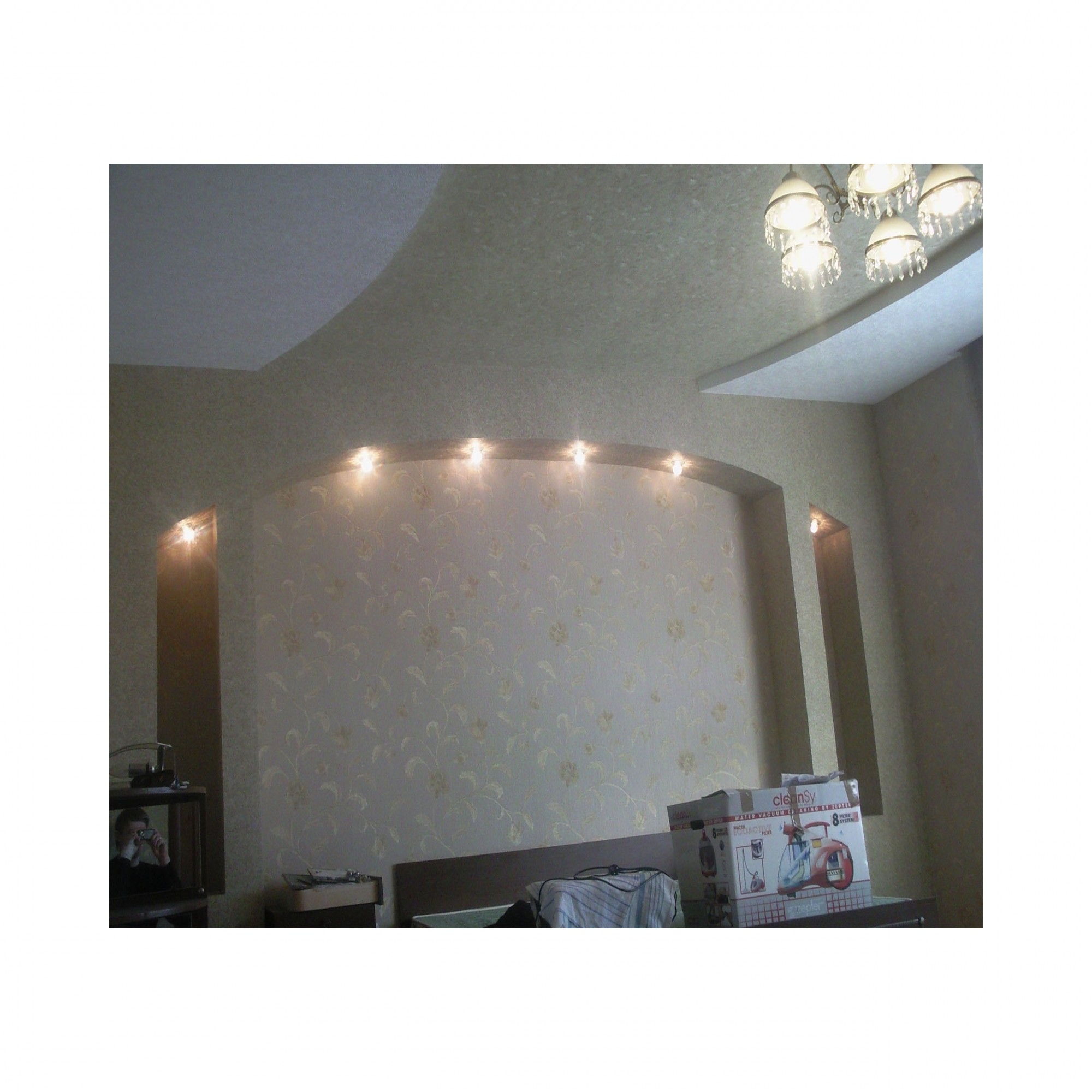 В нишу над кроватью и в боковые арки-ниши встроены светильники, что делает спальню не только уютной в темное время суток, но и добавляет свет на разных уровнях в комнате.