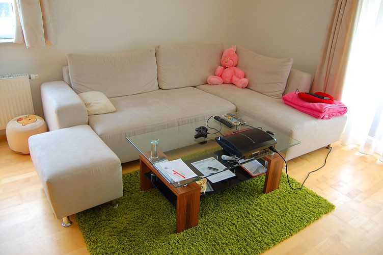 В гостиной стоит большой диван напротив телевизора. У дивана стоит стеклянный журнальный столик.