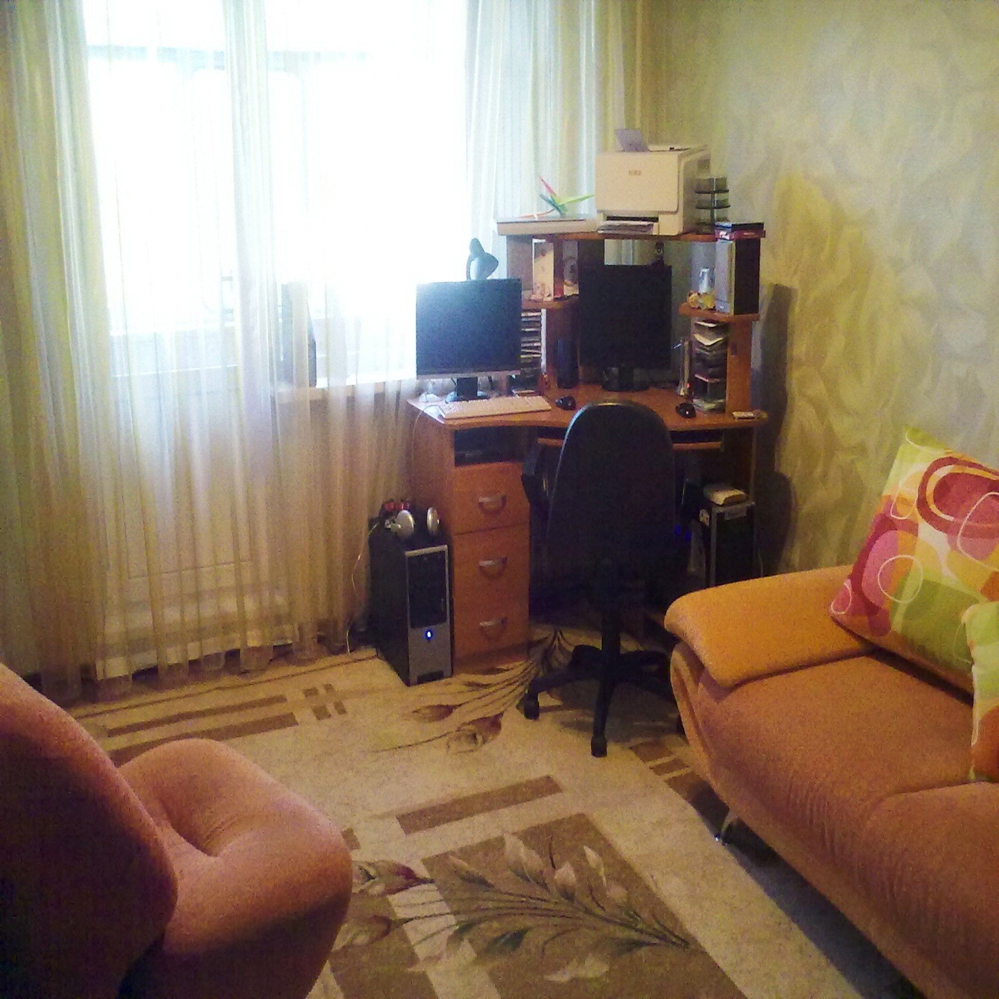 Здесь дан общий вид комнаты. Собственно говоря мебели не много. Но так даже лучше: больше свободно пространства, нет никаких баррикад. Основной тон - оранжевый, разбавлен столь же яркими цветами подушек на диване: желтым, розовым, салатовым. На окне легкая органза светло-салатового цвета. не хотелось Нагружать комнату какими-либо тяжелыми шторами темных уветов.