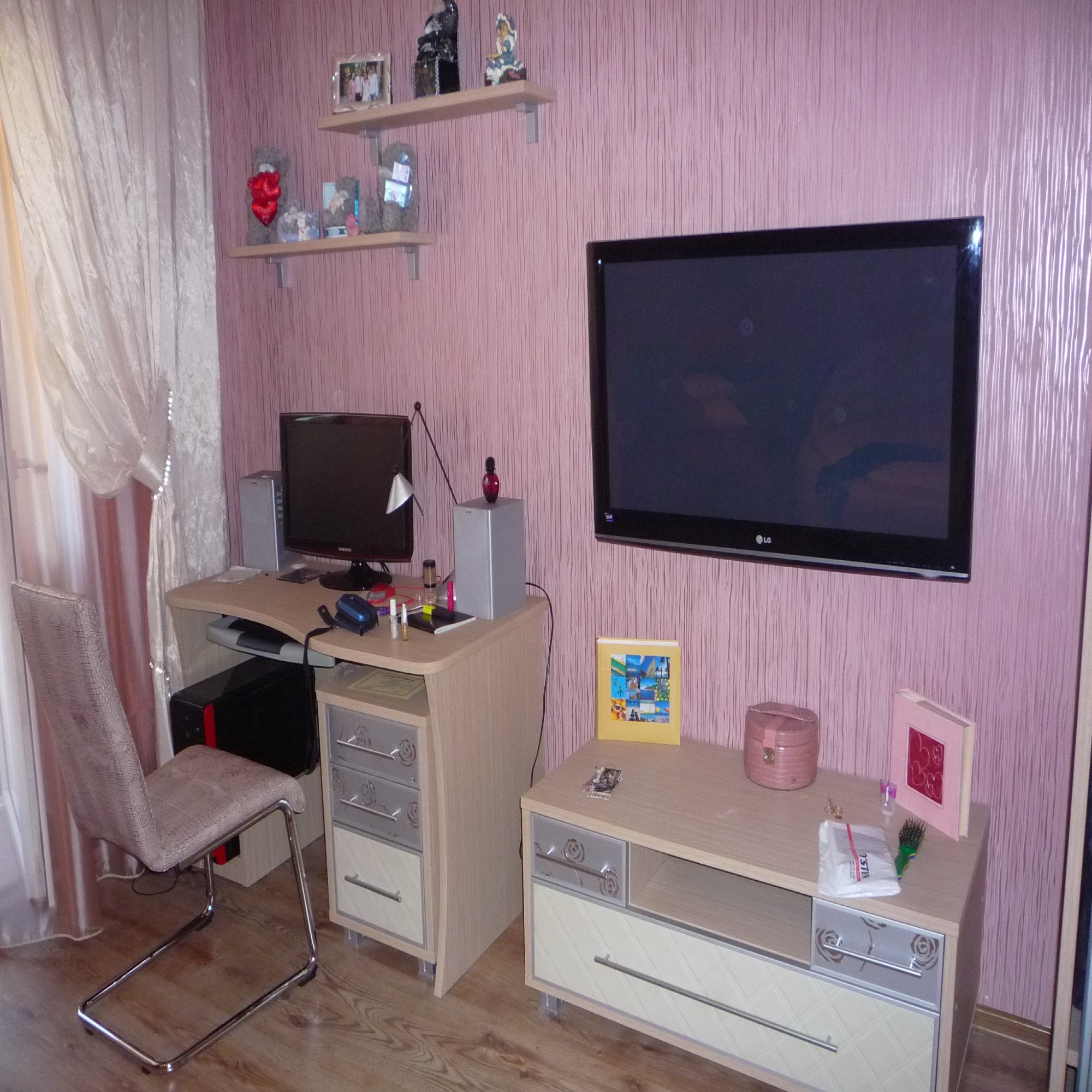 Так как я студентка, мне нужна в спальне рабочая зона. Стол, полки и тумба выполнены на заказ, как и шкаф.