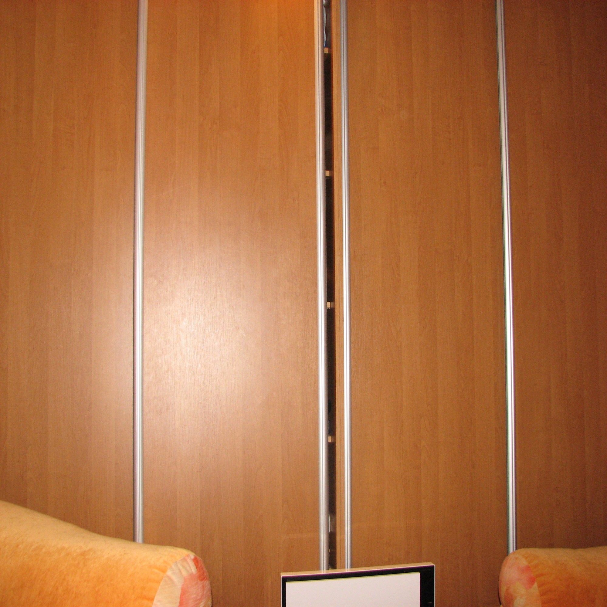 вдоль всей ширины стены стоят два абсолютно одинаковых шкафа- купе. Смотрится просто отлично и эфектно.