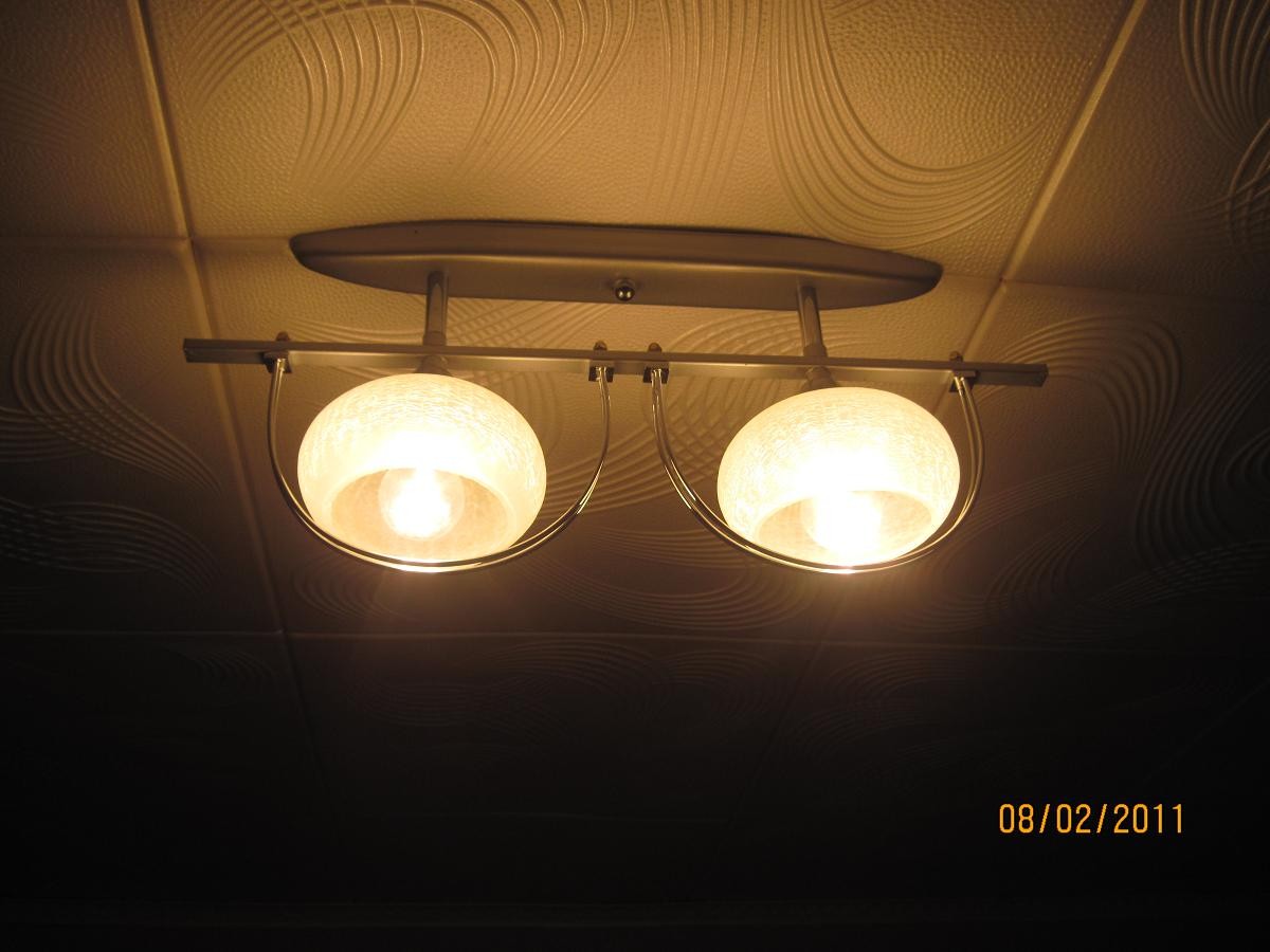 Потолок оклеен кассетонами. В светильнике используем 2 энергосберегающие лампочки. Они дают очень много света.