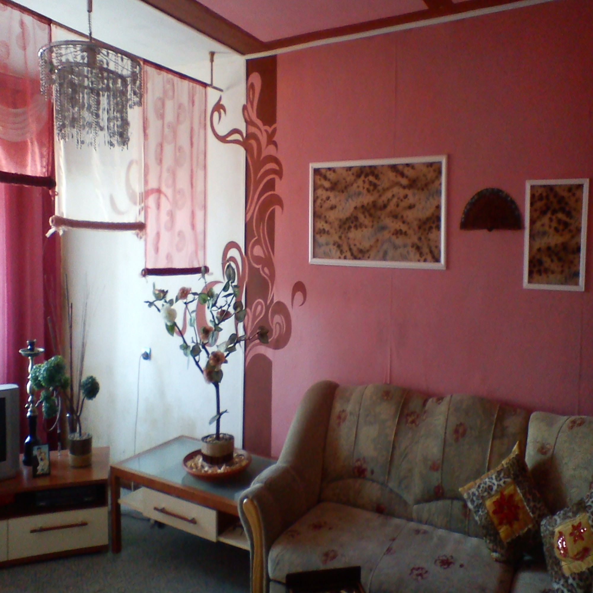 часть комнаты,по периметру,также обклеена потолочным плинтусом.Хороший контраст, да и скрывает некоторые недочеты строительства типовых квартир.