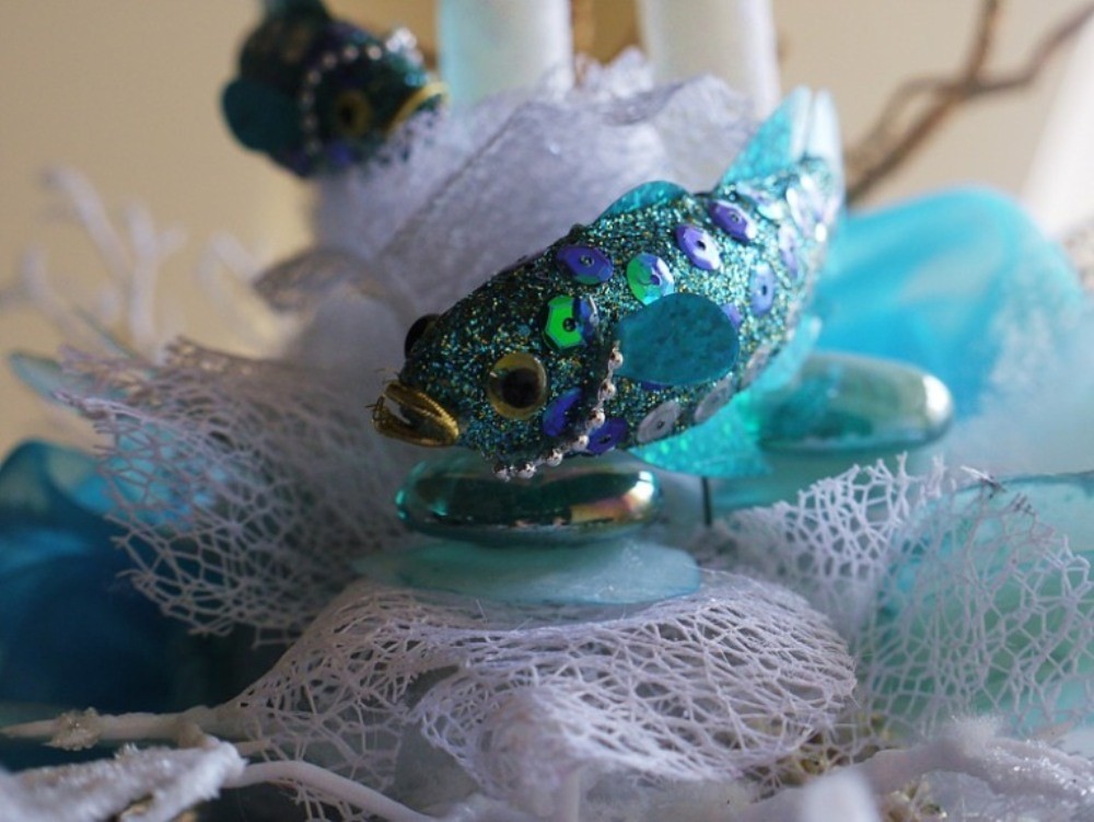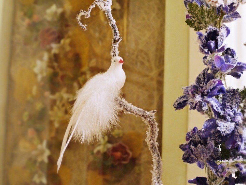 Веточка, на которой сидит белая птица. Позади композиция из цветов, встроенных в стену с помощью пластиковой панели.