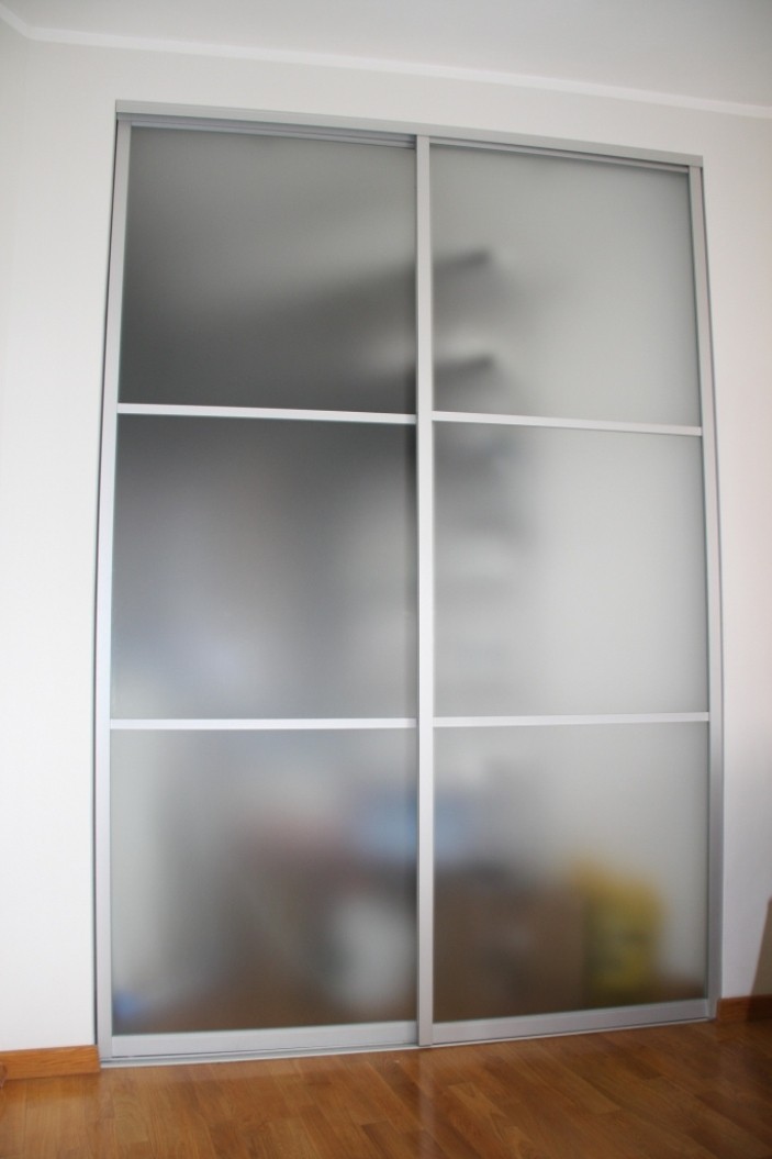 Матовые полупрозрачные раздвижные двери гардеробной комнаты продолжают линию стены. Секционно дверь разделана на квадраты