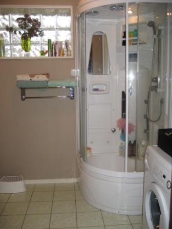 Душевая кабинка экономит место в ванной.Пол у нас теплый,поэтому коврики не требуются)))