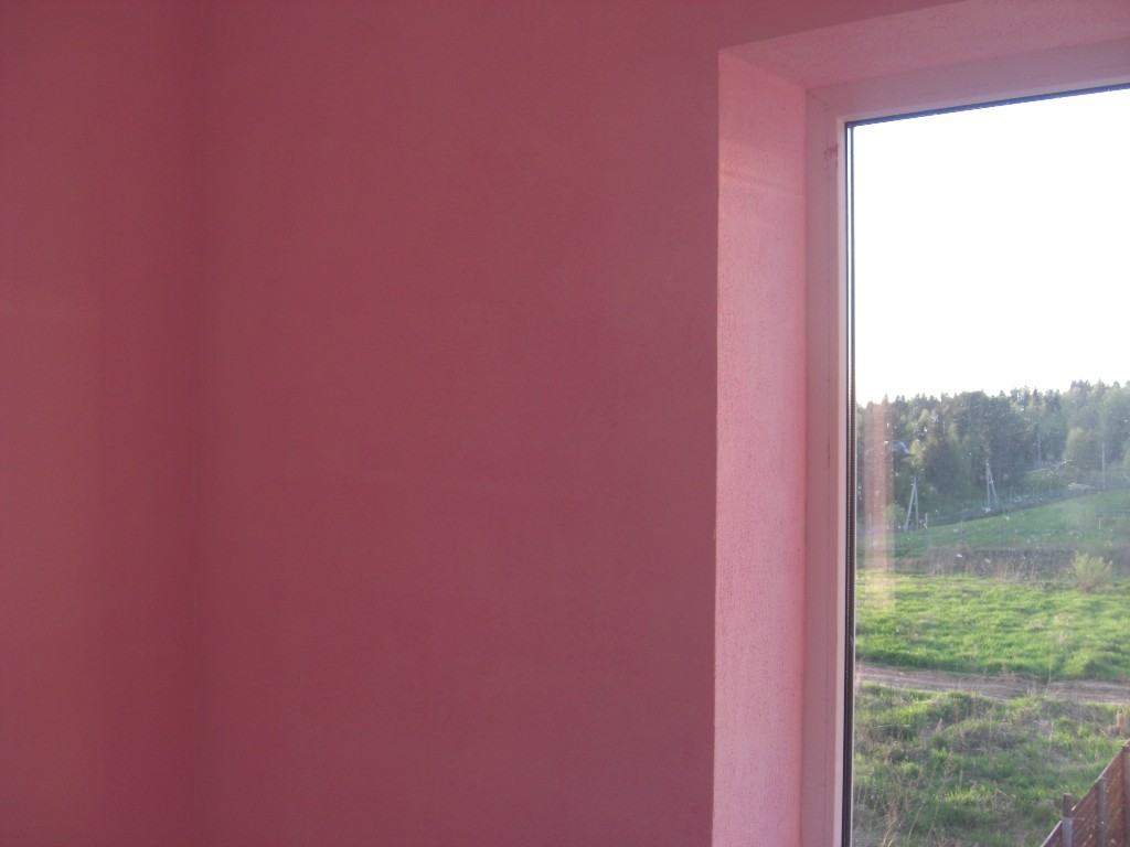 Сначала отделали стены однотонным, розовым цветом в одной комнате. Валики использовали поролоновые и наносили краску сверху вниз. А у самого потолка узким валиком, прикрывая потолок широким шпателем, что бы не испачкать побелку.
