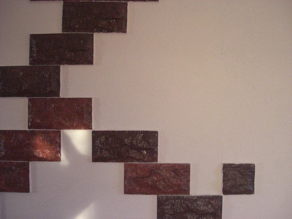 Весь первый этаж отделали бежевой краской с декорированием стен плиткой под камень. Камни брались обычные искусственные и окрашивались в два оттенка коричневого цвета: светлого и тёмного.