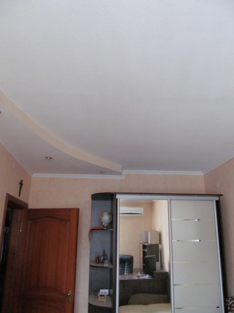 А это половина освещения комнаты. Зеркально расположено еще 3 лампочки. Освещения хватает. Белый цвет потолка не давит. И зрительно расширяет комнату.
