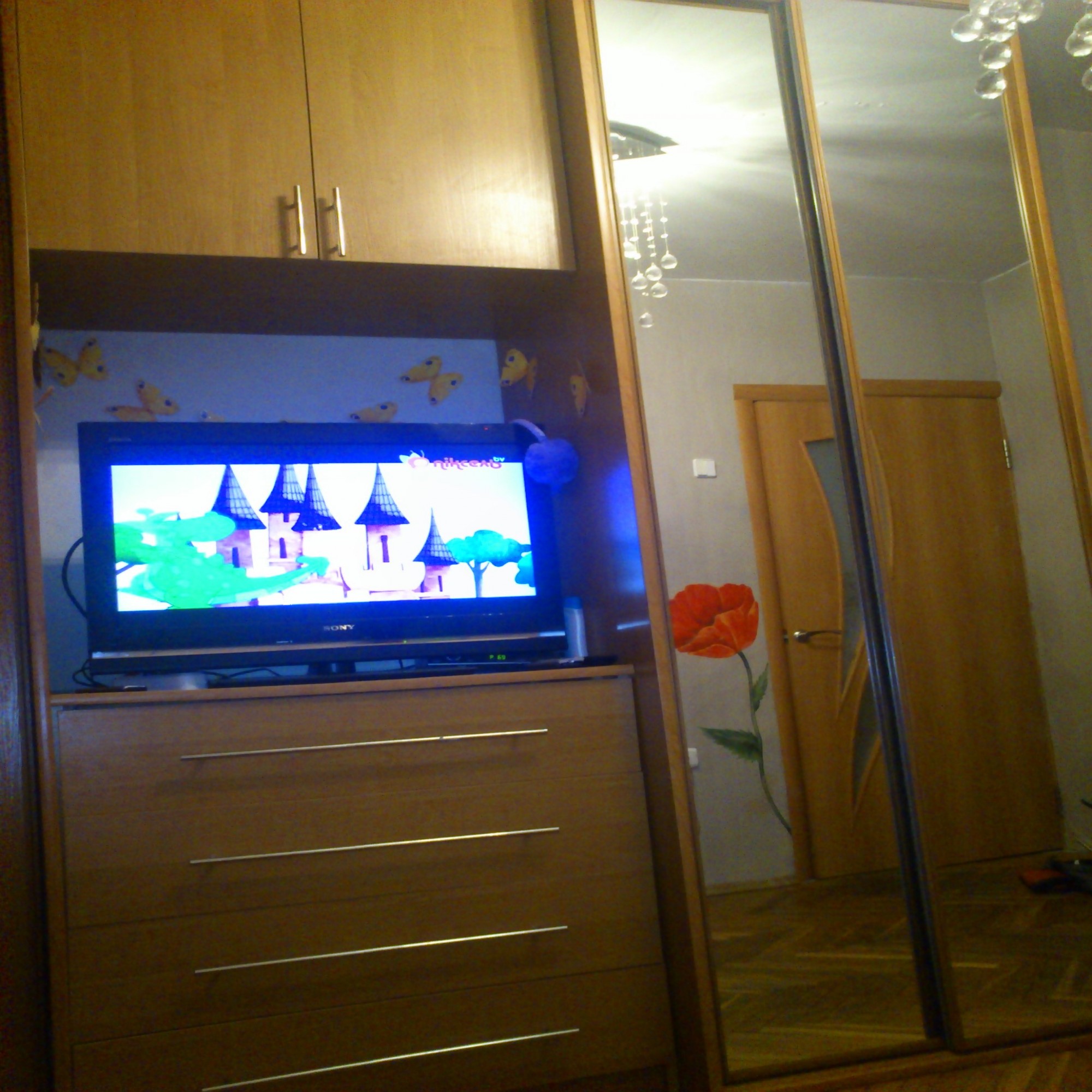 Гирокий шкаф-купе на всю стенку с различными ячейками для всех домашних потребностей и нишей для телевизора.