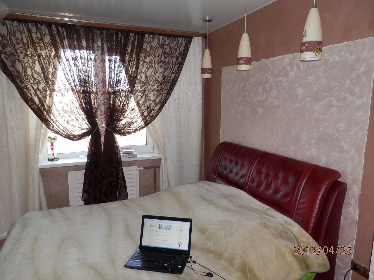 Зона спальни. Стены покрашены декоративной штукатуркой. Темно коричневый цвет - краска под бархат...