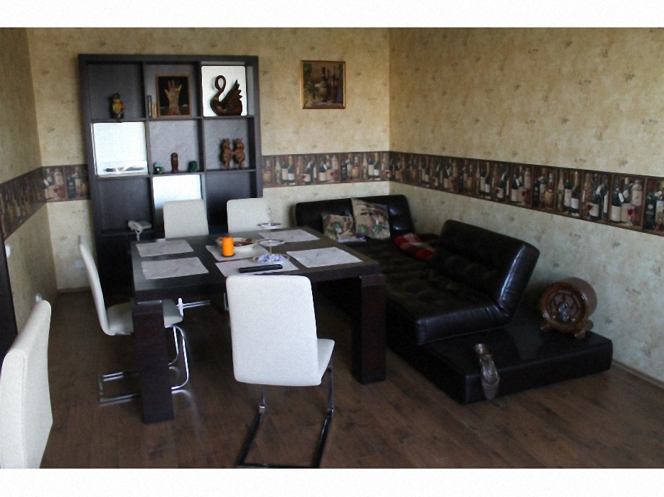 Раскладной низко посаженный диван, стол и шкаф были выбраны все по отдельности но, дополнили друг друга, создав уютную атмосферу.