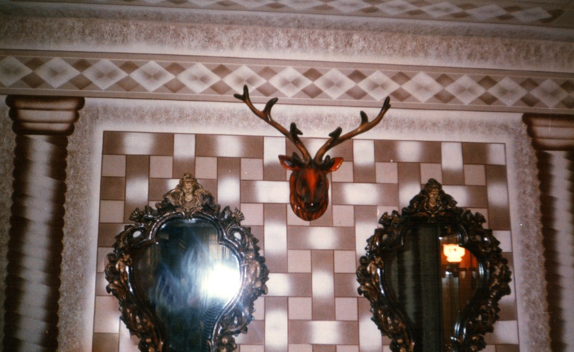 Холл перед входом в гостиную. Все рисунки на стенах выполнены вручную при помощи трафаретов, в тон зеркал.