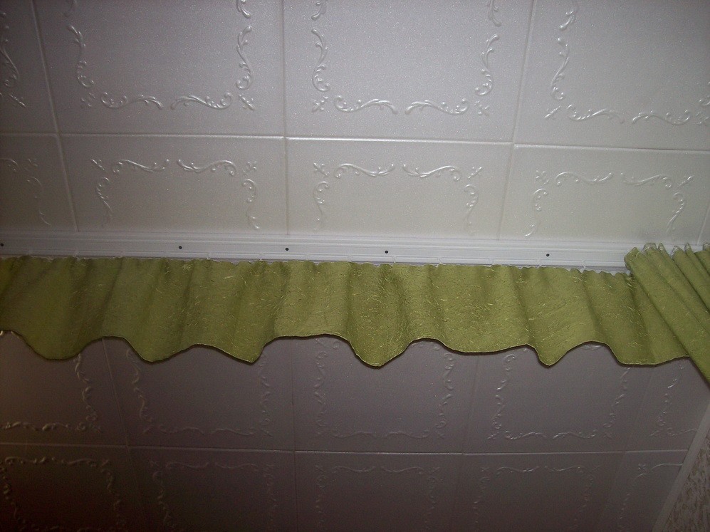 зелёная ширма из штор держится благодаря потолочной гардине, которую рабочий закрепили на потолочной плитке.