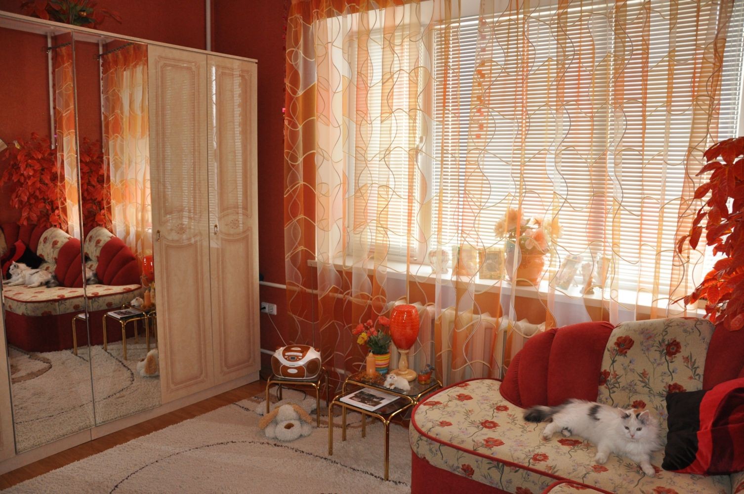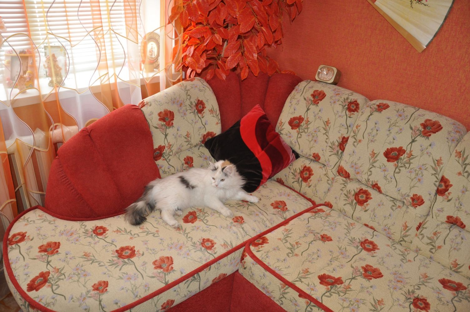 Диван уголком связывает по цвету бежевые и красные элементы комнаты. Кошка не связывает ничего, и служит просто удачным элементом дизайна :)