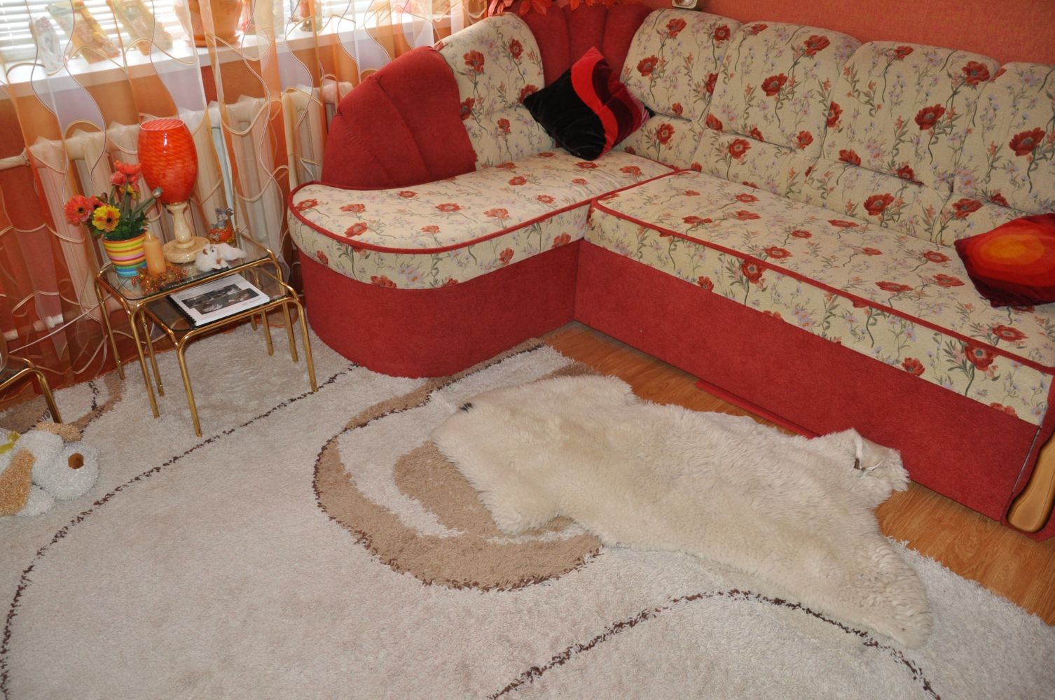 Получив в качестве приданного ламинат "под дерево", хозяйка тщательно прикрыла его светлыми и бежевыми коврами, насколько это было возможно. Отдельным элементом лежит у дивана шкура неизвестного происхождения.