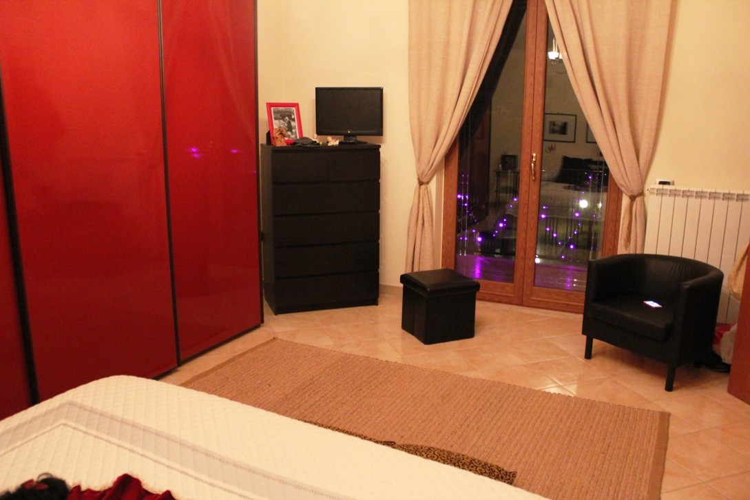 Выход на балкон. Деревянные окна-двери. Кожаное кресло и пуфик. Небольшой комод, на нем небольшая плазма