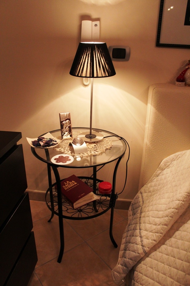 Прикроватный бронзово-стеклянный столик, на котором стоит очень стильный квадратный светильник-ночник.