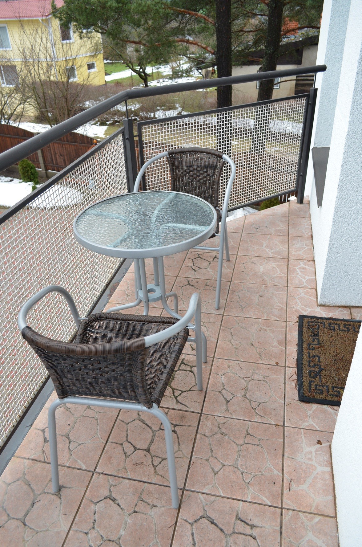Постелили на пол шершавую плитку нейтральной расцветки. Шершавая - что бы не скользить. Очень приятно утром выпить кофе, сидя на балконе и обозревая окрестности.