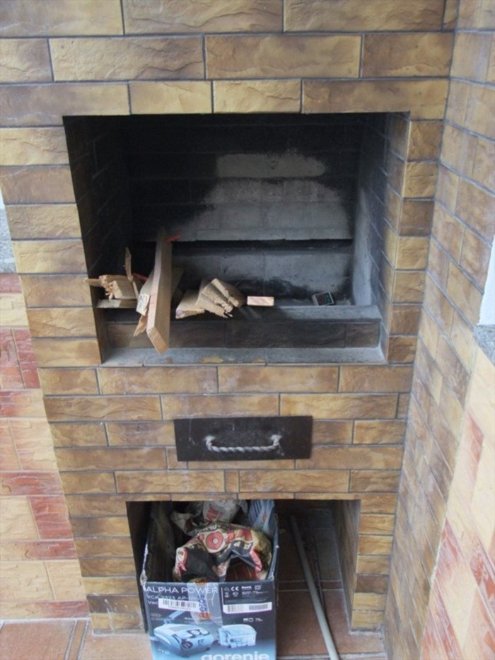 Камин сделан не большой, по всем правилам вытяжки, внизу место для хранения угля и других принадлежностей, отделан плиткой.