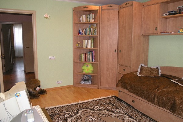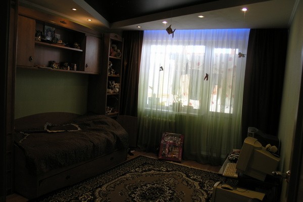 Тюль подбирали под обои. К низу они зеленые...