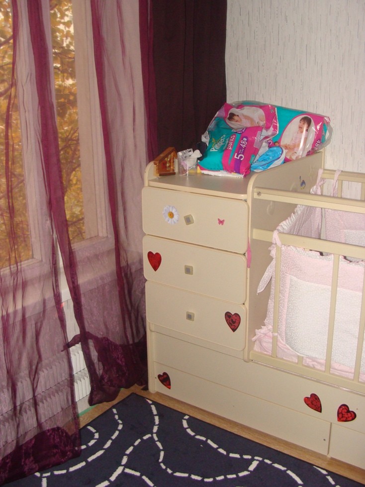 Детская кровать+комод+пеленальный столик. В комнате места немного, поэтому такая кроватка стала отличным выходом, она занимает минимум места.