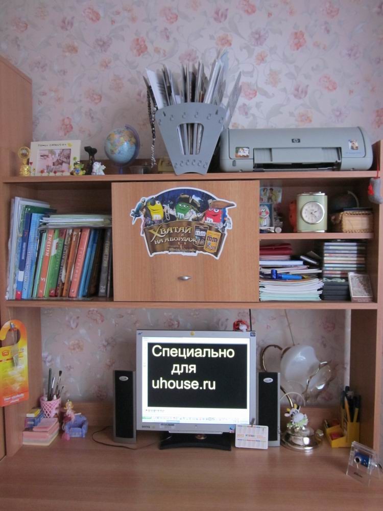 Главное в комнате школьницы - письменный стол. На нем и домашку можно сделать, и в компьютере полазить. А если он и с полками, то приобретает ипостась склада кучи нужных и не очень вещей.