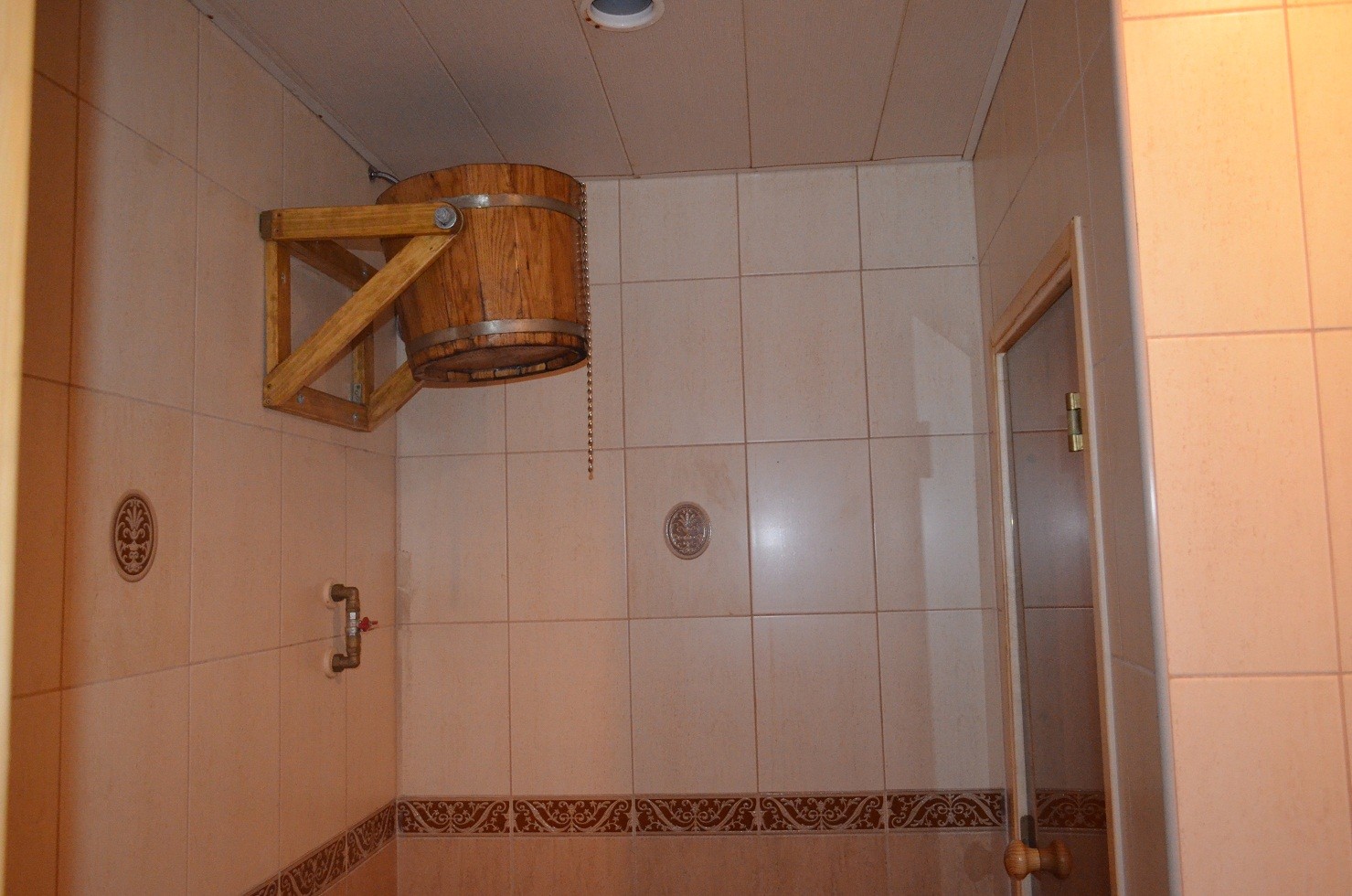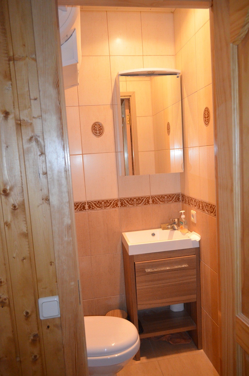 Из раздевалки вход в туалет. Туалет крошечный (0,8х1,20) но как видите все необходимое поместилось. Над унитазом выглядывает кусочек бойлера. Мы его под потолок повесили в целях экономии места.