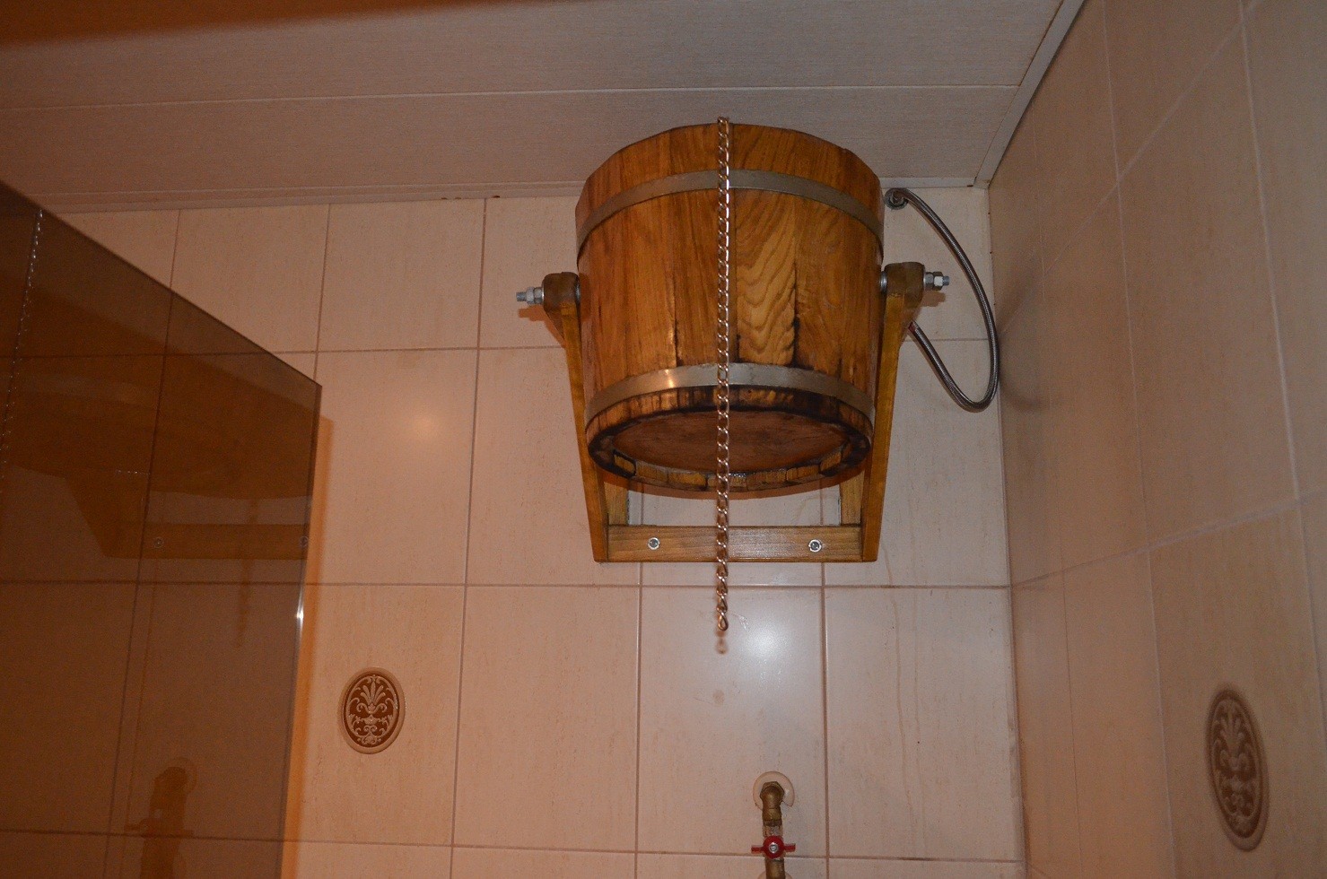 Это поливалка :) очень важная вещь. Купить ее в нашем регионе мы не смогли, сделали сами. Грубо говоря - это ведро которое наполняется ледяной водой, выйдя их парилки, дергаете за веревочку и вас окатывает ушат ледяной воды :)
